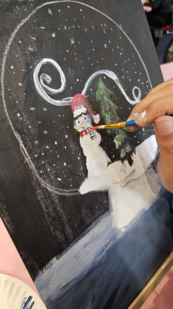 The painting prompt was to paint snowmen and a Christmas tree inside of a snow globe.
