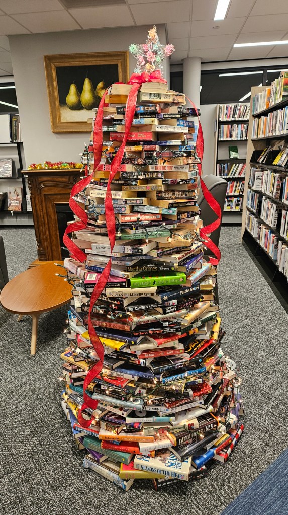 I love this book Christmas tree! 😍📚 The library puts this display up every December, and I always look forward to seeing it.