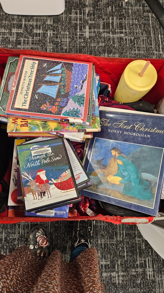 We ended up checking out a lot of Christmas books and DVDs. 😄