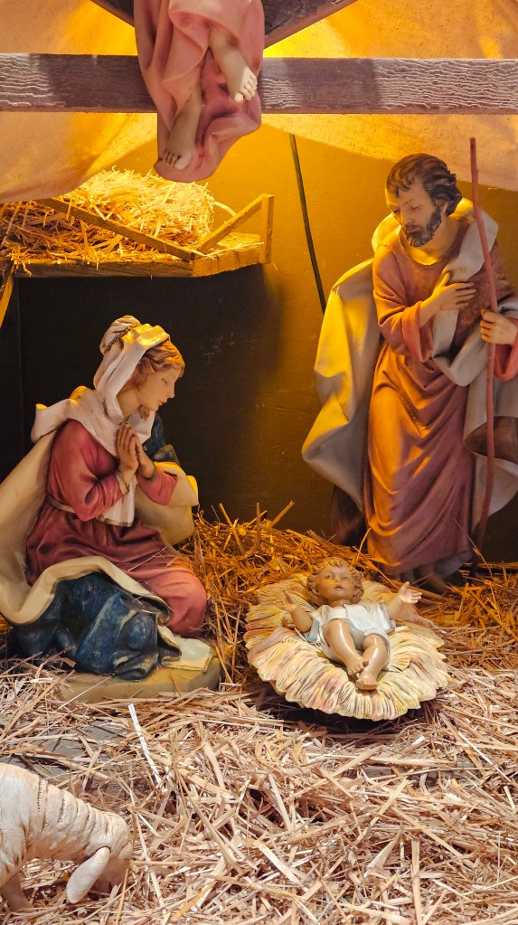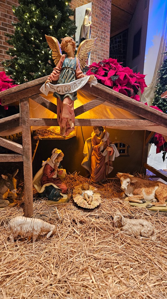 The church was decorated beautifully with Christmas trees, big wreaths hanging on the walls, the Nativity scene, and twinkling lights.