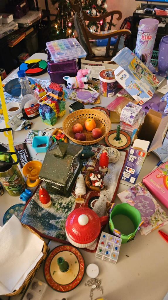 This is what the day after Christmas looks like: children’s gifts scattered about the table and all over the main room.