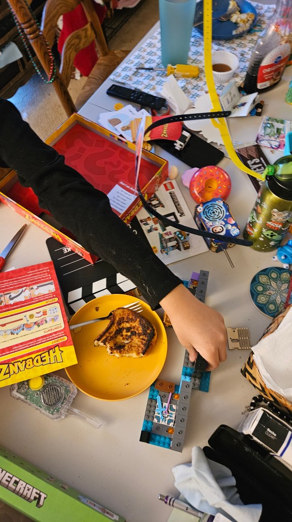 Opened boxes, crumbled packaging paper, Lego blocks on the table and the floor, ferocious dinosaurs with slime (gotta make sure the slime stays off the carpet!), board games with the tokens found here and there, French toast and a bottle of maple syrup, and soft, squishy plush dolls.