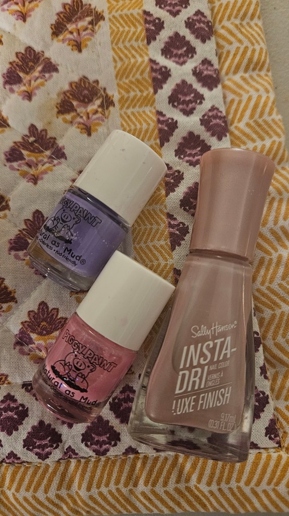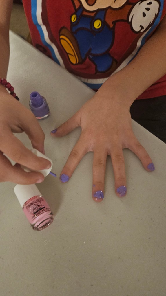 Zaya and I painted our nails. I painted my nails a soft, shimmery color called “Triple Thread.”