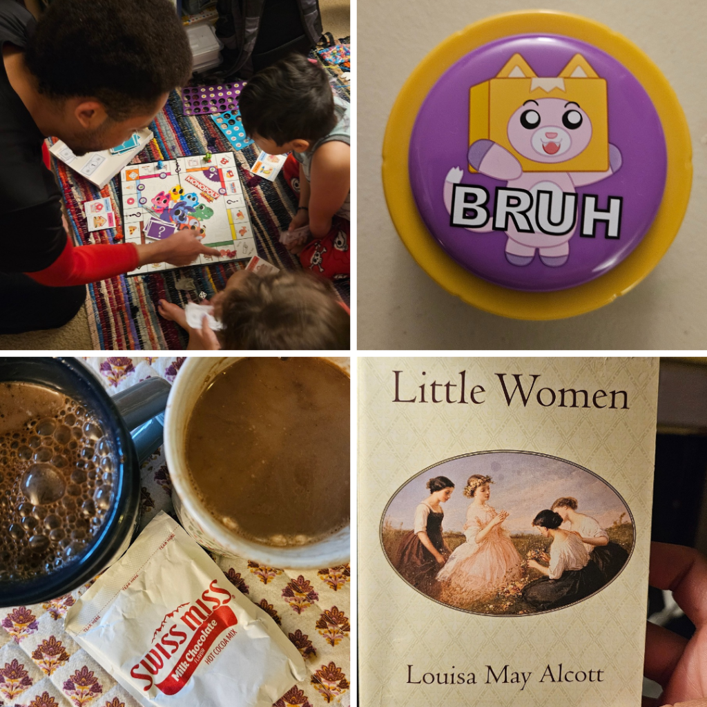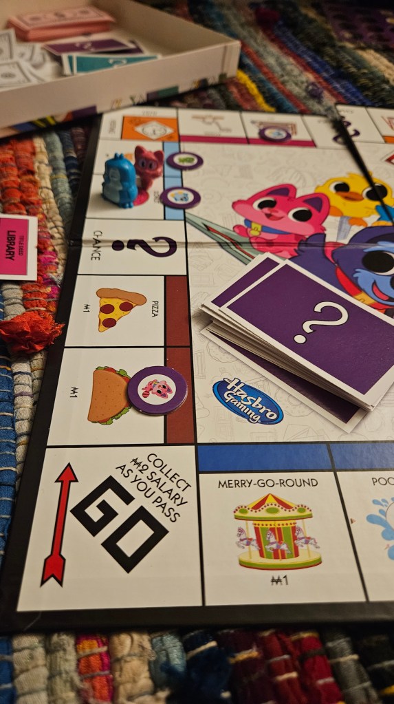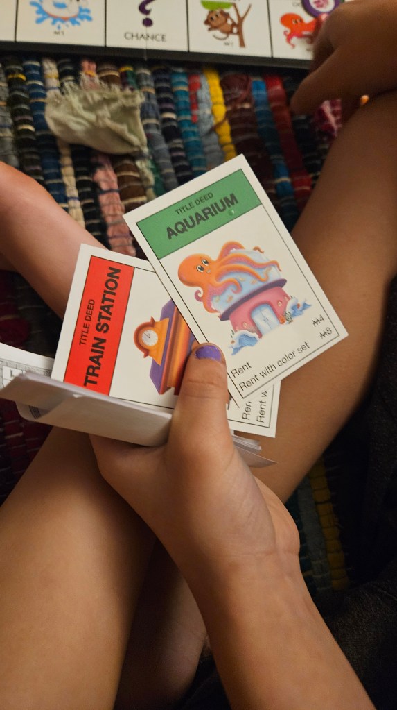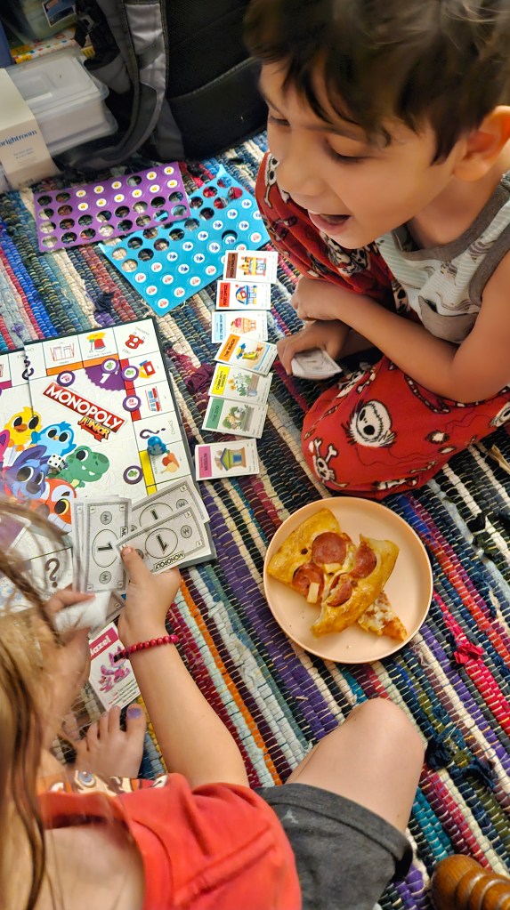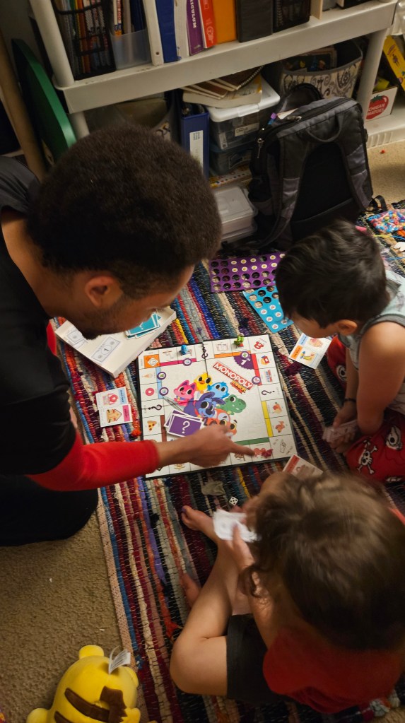 He played Minecraft with Zhen (13) and Zechariah (10) for a little bit, and then he played Monopoly Junior with Zephaniah (8) and Zaya (5). Zephaniah won. 😄