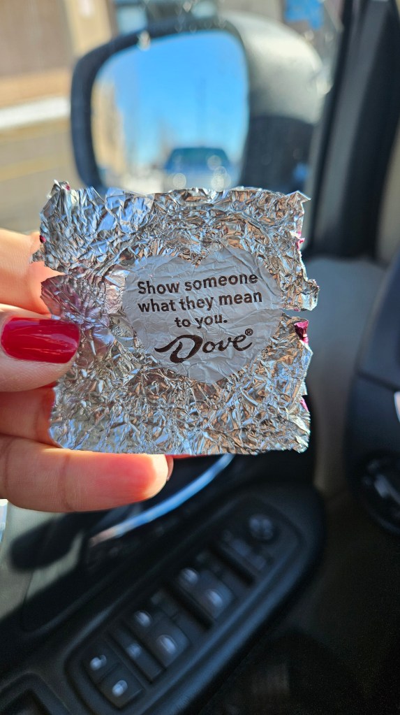 “Show someone what they mean to you.” A message on the inside of the wrapper of my Dove milk chocolate.