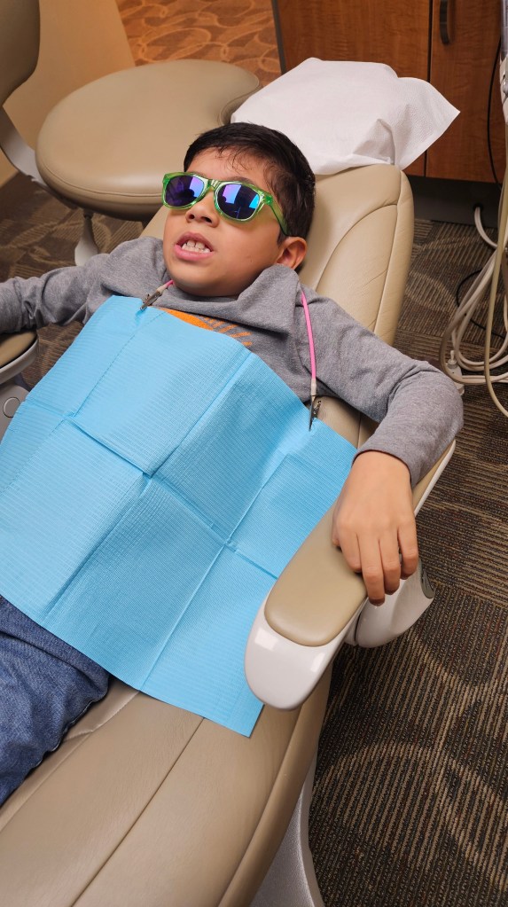 Zephaniah at the dentist. They give the kids fun sunglasses to wear so the bright light doesn’t bother their eyes. 😎
