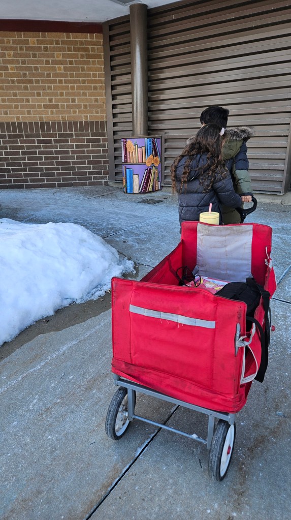 Zaya (5) and Zephaniah (8) pulling the wagon to the library. 📚
