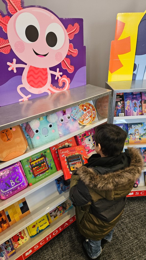 Zephaniah checking out the axolotl merch at the book fair. The kids are obsessed with axolotls! 😅