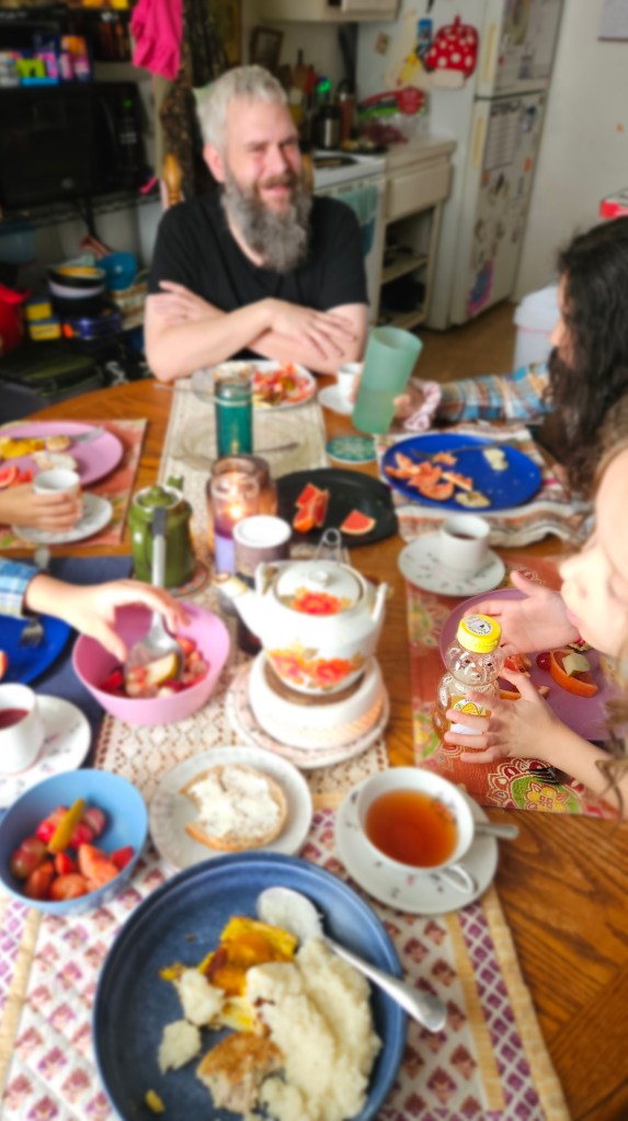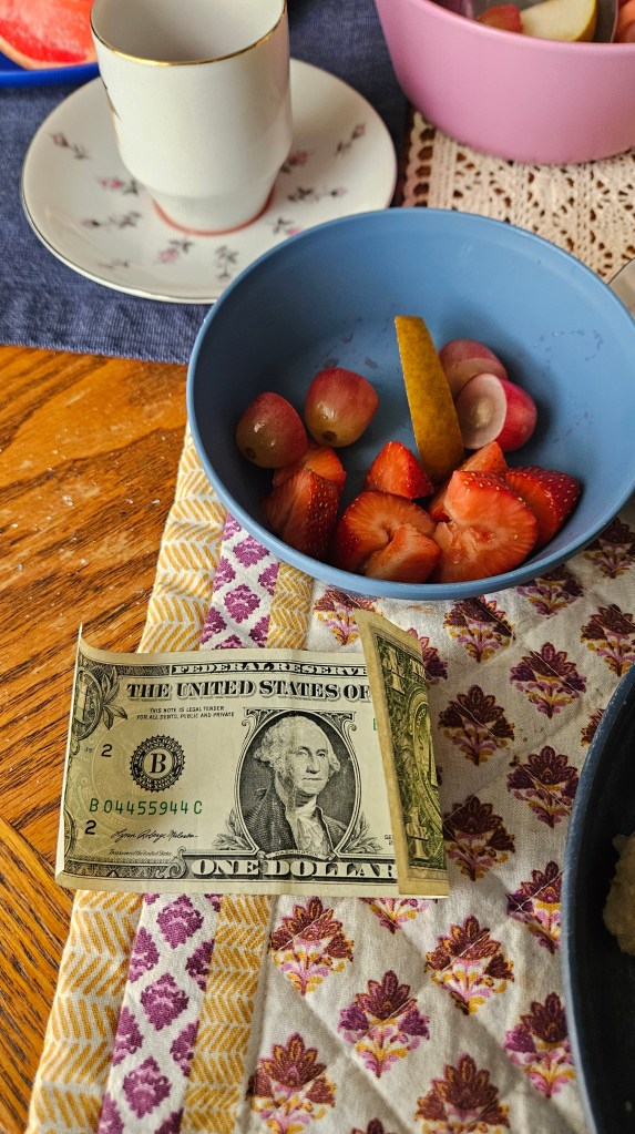 After brunch. Zechariah (10) handed me a dollar and said it was my tip for cooking such a delicious breakfast. Lol! 😄
